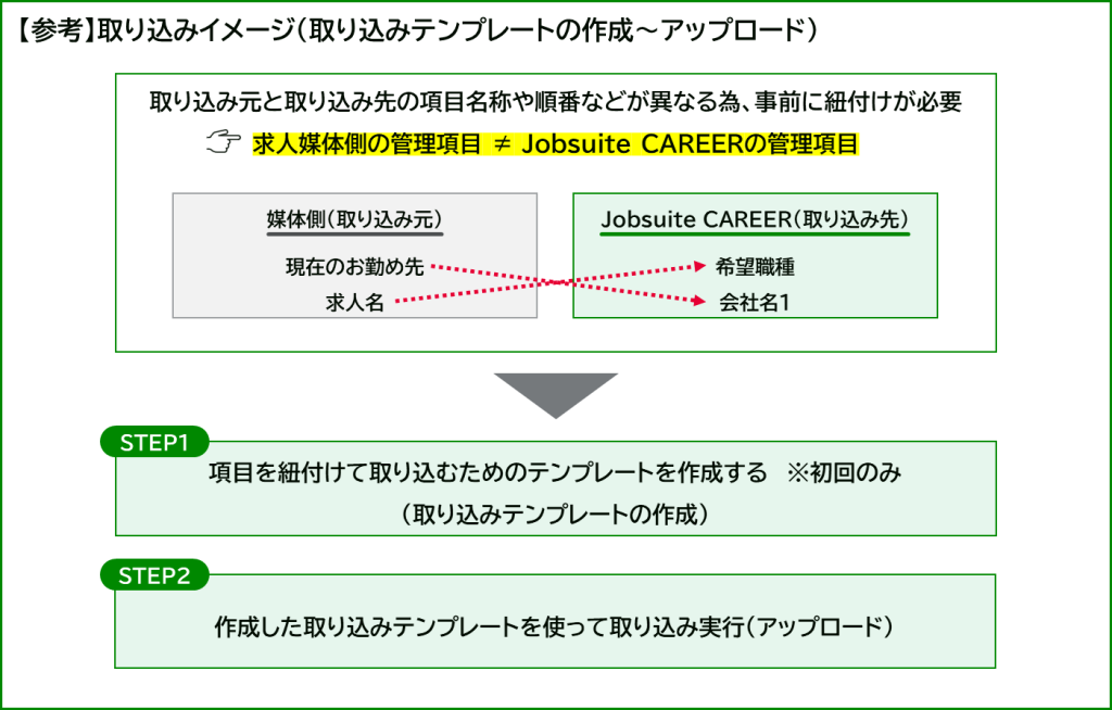 各種Web媒体からダウンロードを行った応募者一覧のファイルや、表計算ソフトなどで管理している応募者データを取り込むには、初回のみ事前に「取り込みテンプレート」の設定が必要になります。
