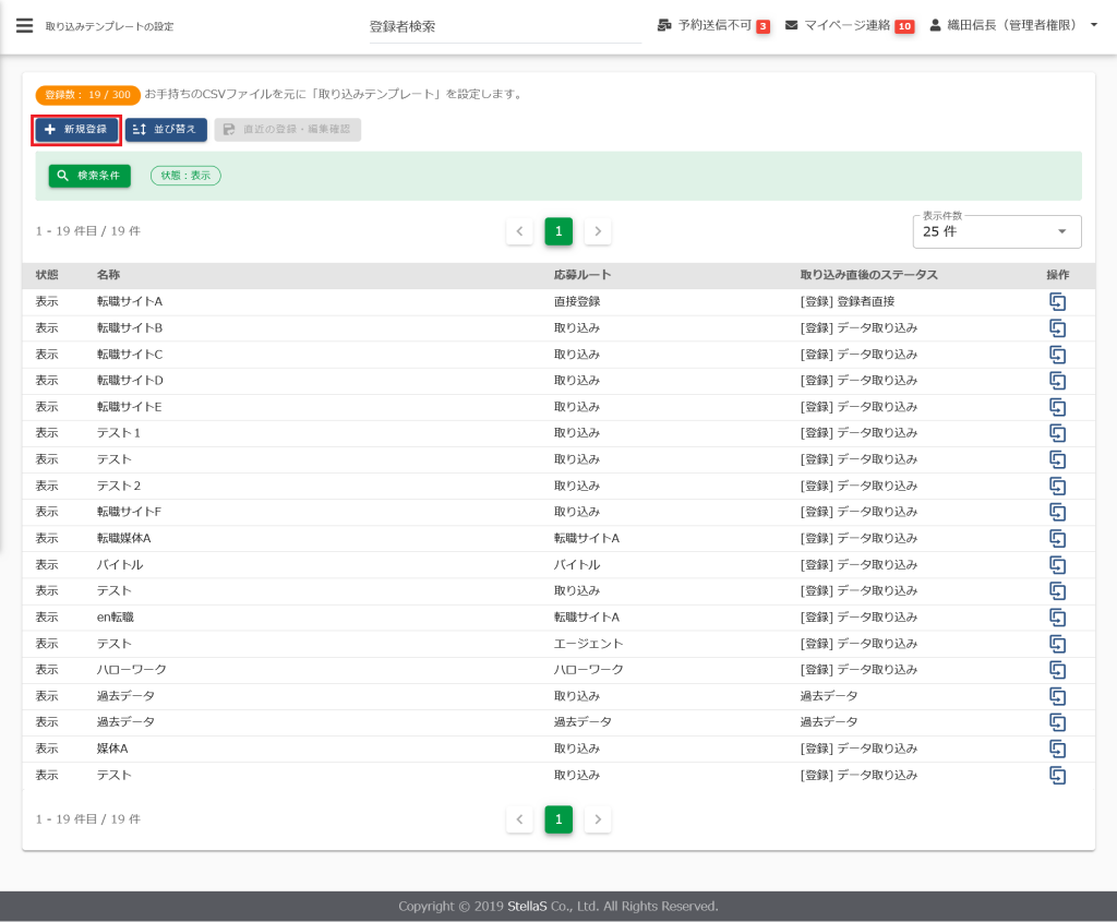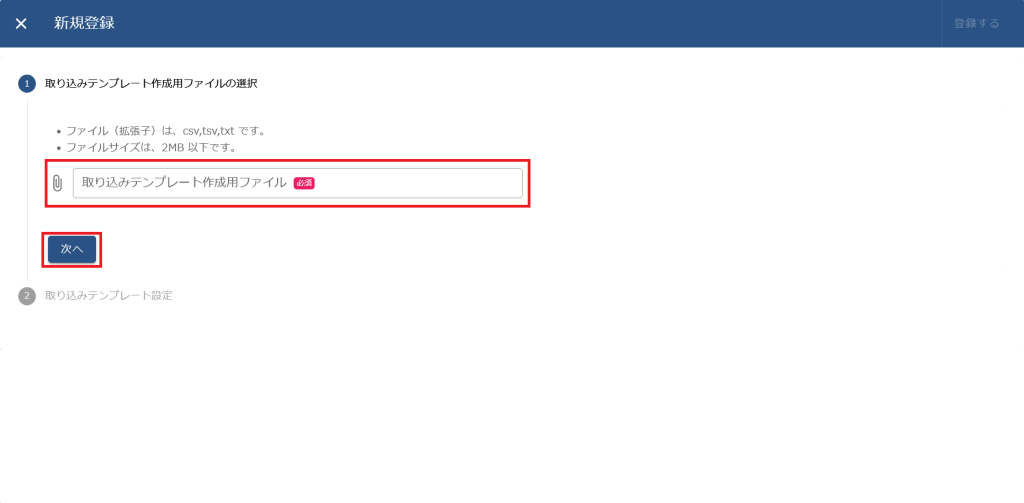 (2)取り込みテンプレートを新規追加する場合は、[+ 新規登録]をクリックします。