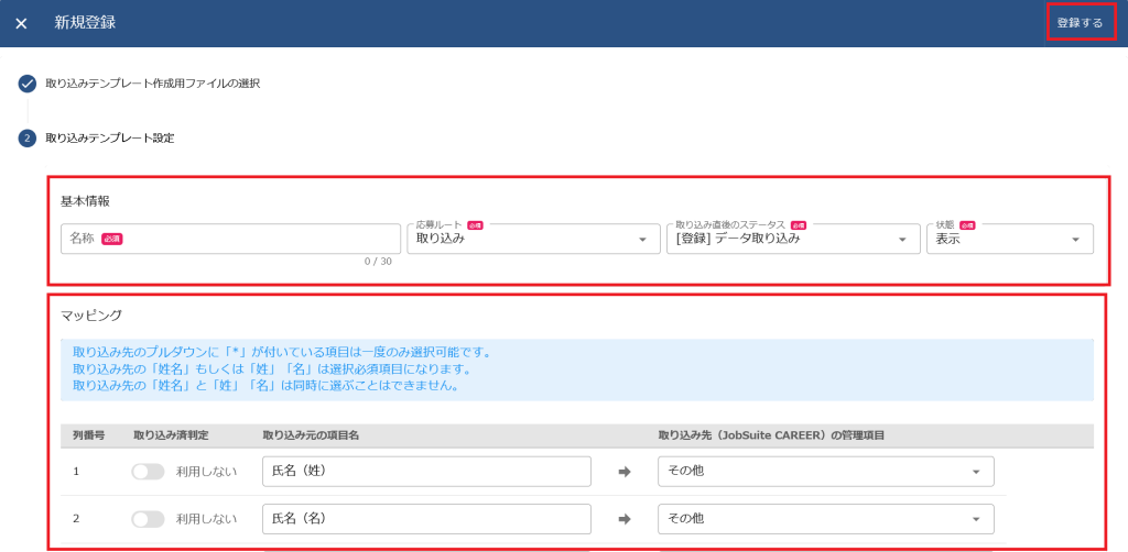 (4)「取り込みテンプレート名」「応募ルート」「ステータス」、マッピングにてCSVファイルの項目名とシステムの項目名の関連付けを行い、[登録する]をクリックします。