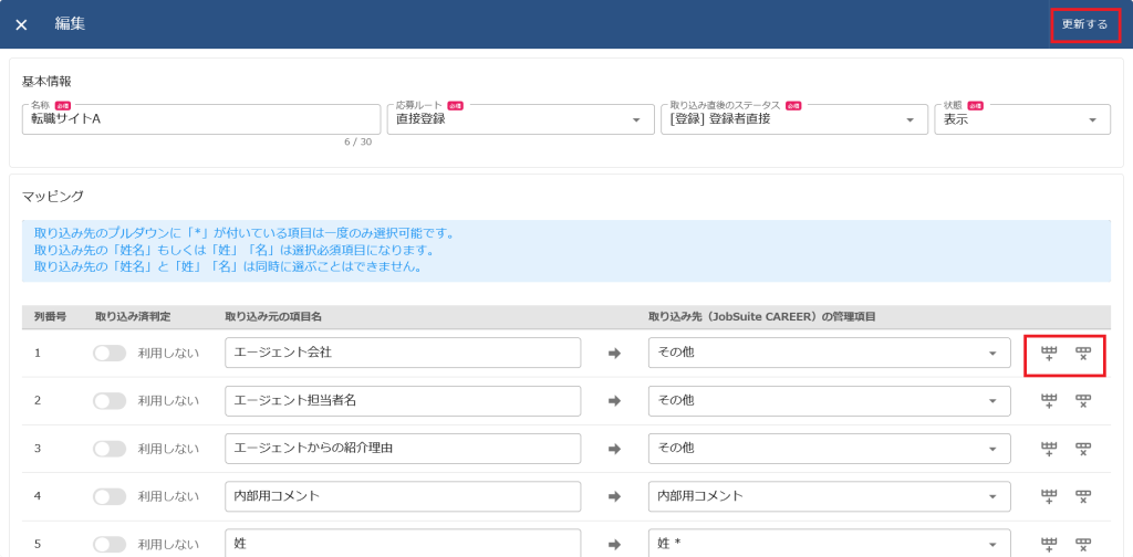 (7)基本情報、マッピングの各項目を変更後、[更新する]をクリックします。