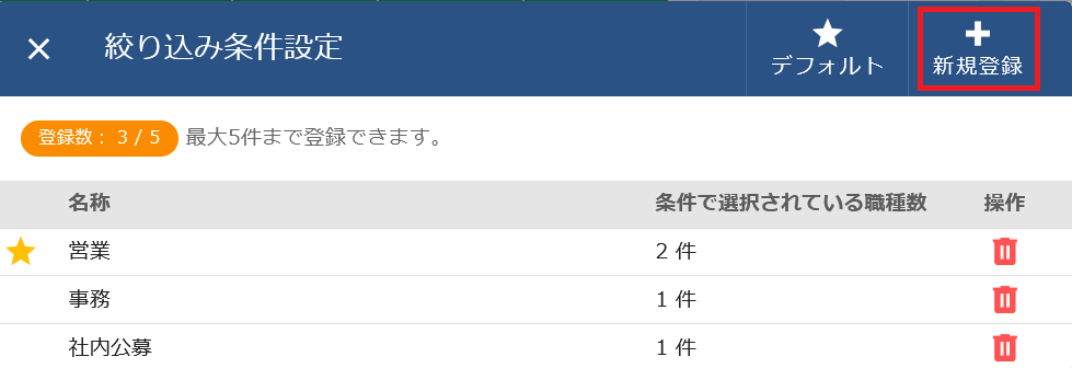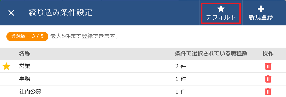 [⚙️]をクリックすると、絞り込み条件をユーザー別に最大5つまで、条件名を付けて保存することができます。複数の絞り込み条件のうち、1つをデフォルトとして設定ができます。