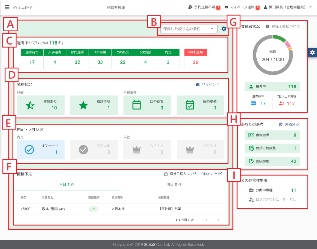 「本日」と「明日」の面接予定者の件数と登録者リストを表示します。登録者名をクリックすると詳細画面を確認することができます。
