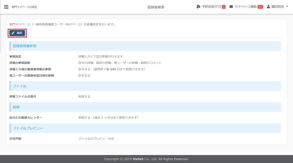 部門マイページ(一般利用者権限ユーザー向け)の登録者情報の参照範囲と評価ファイル添付等の設定を行います。