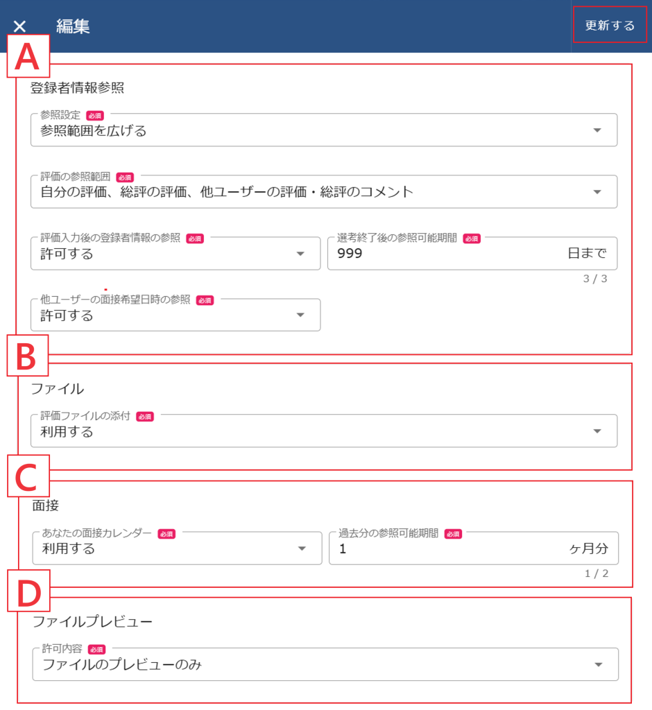 一般利用者権限ユーザーが参照できる評価範囲(選考状況確認を含む)を設定することができます。