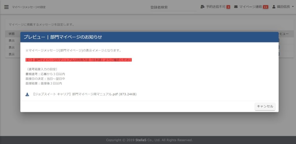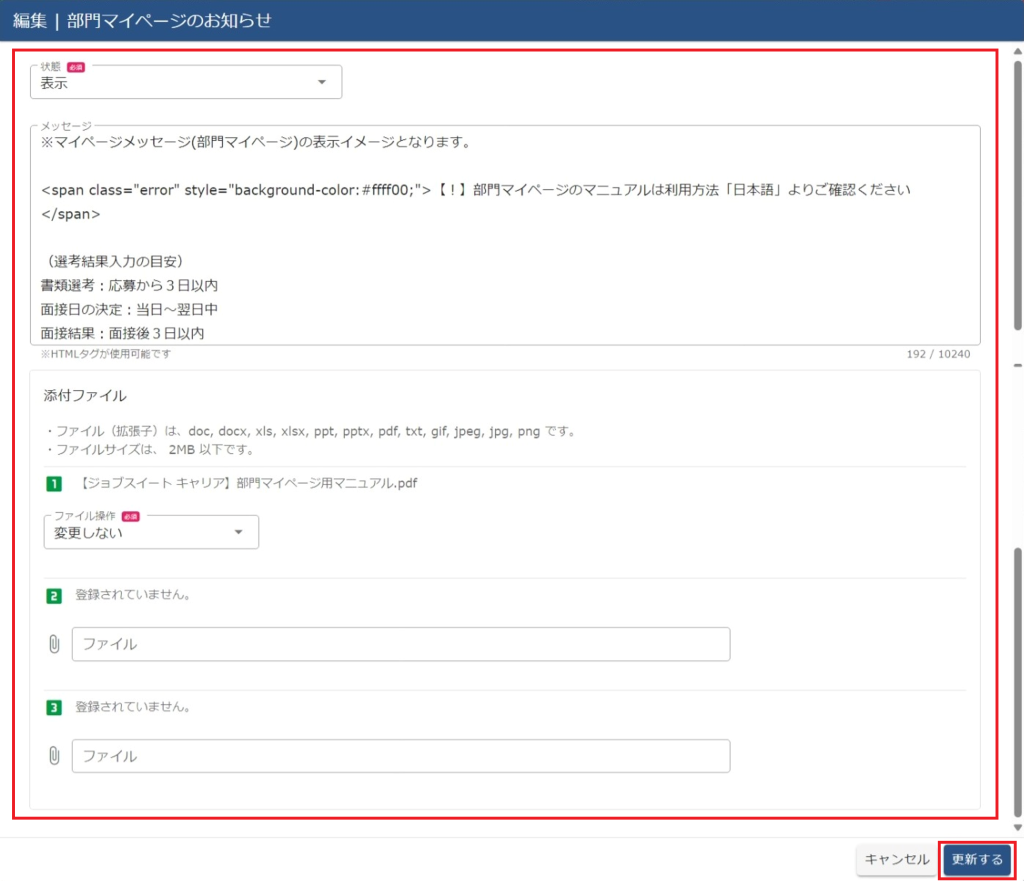 (4)「メッセージ」内に掲載したい内容を入力します。また、ファイルをメッセージに最大3つまで添付できます。設定したファイルは部門マイページからダウンロードすることができます。