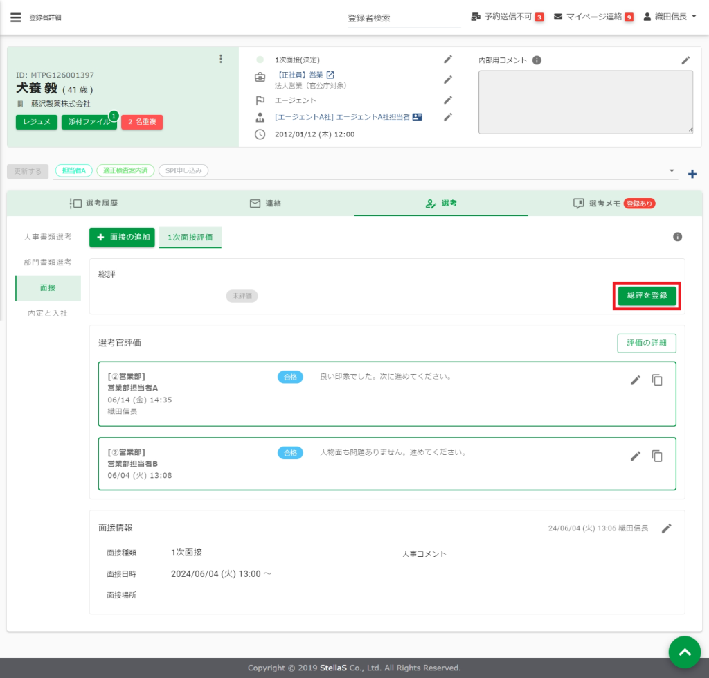 「総評」について 「総評」は入力しなくても、次の選考ステップへ進めることができます。[総評]を入力するメリットは、①ステータスの自動連動による変更漏れ防止、②選考官の評価を集約した結果、最終的にどのように判断したかという記録が残せる点です。![]()