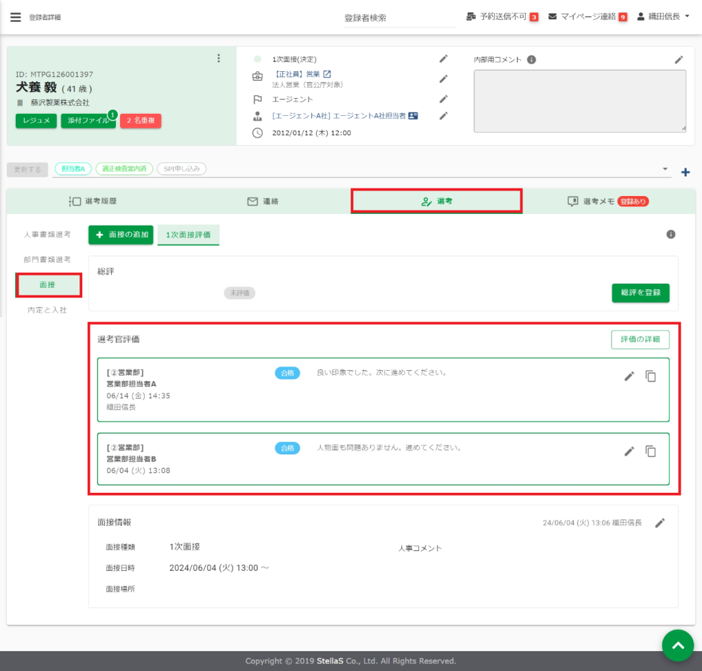 (3)部門面接選考者の評価結果をもとに、[総評]を入力し面接の結果を決定します。[総評]を入力することで、ステータスが連動して変更されます。