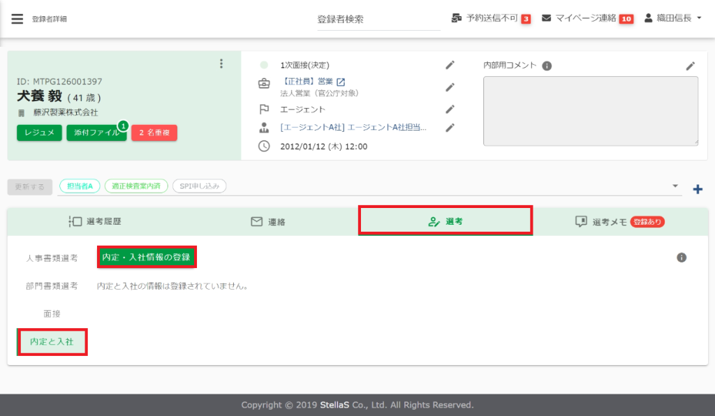 (1)登録者詳細画面の[選考]→[内定と入社]→[内定・入社情報の登録]をクリックします。