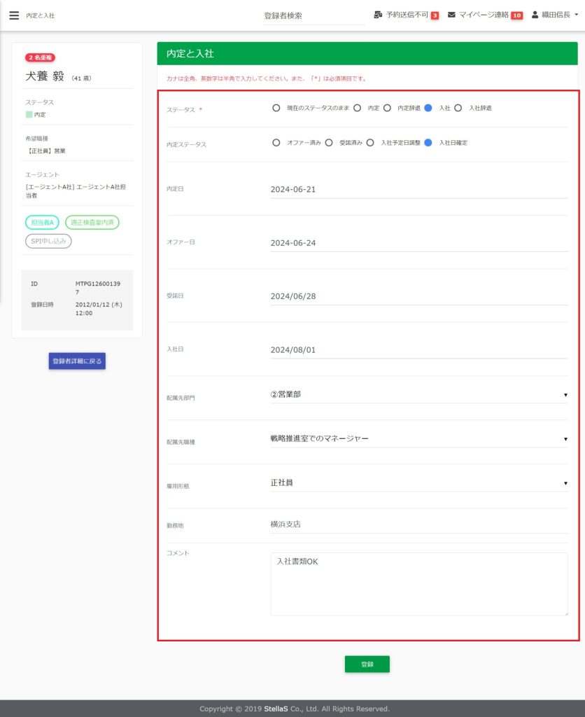 (2)ステータス[入社]を選択し、その他必要な項目に情報を入力して[登録]をクリックします。