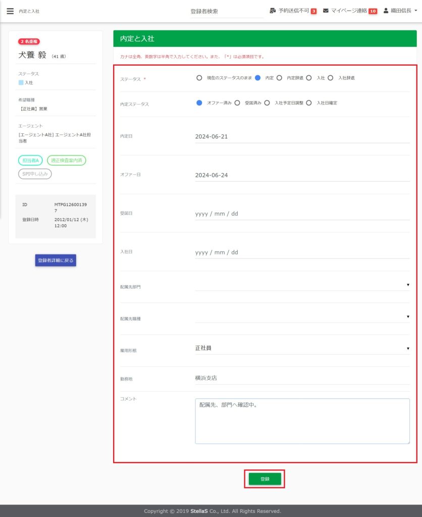 (2)ステータス[内定]を選択し、その他必要な項目に情報を入力して[登録]をクリックします。