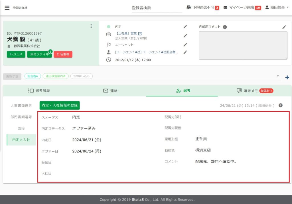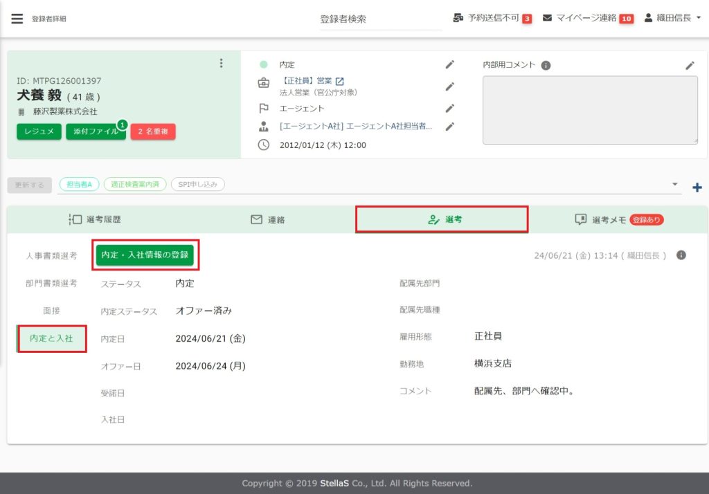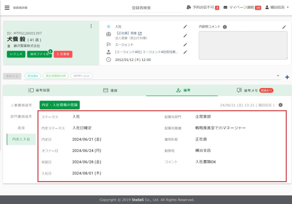 登録者のステータスを「内定」「入社」に変更し、内定・入社情報の管理を行うことができます。