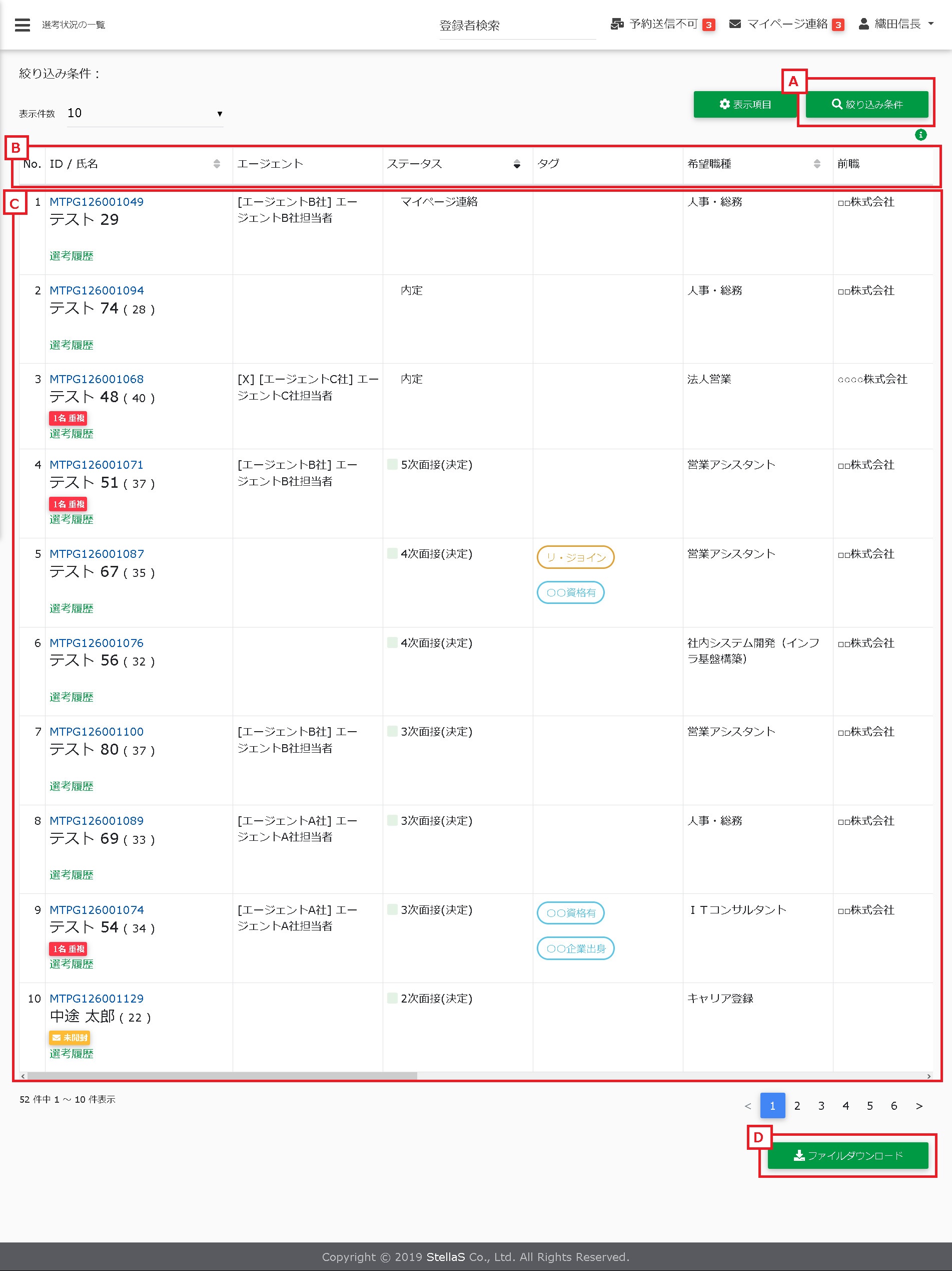 - 選考分類が「選考中」のステータスの登録者が一覧で表示されます。