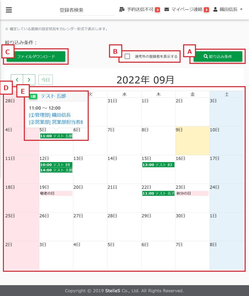 表示されている面接日に関する様々な条件で絞り込み表示することができます。