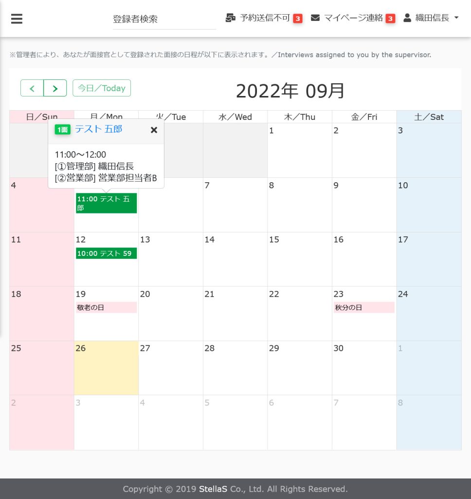 サイドメニューより[選考]をクリックし、[面接日程カレンダー]をクリックすると表示されます。