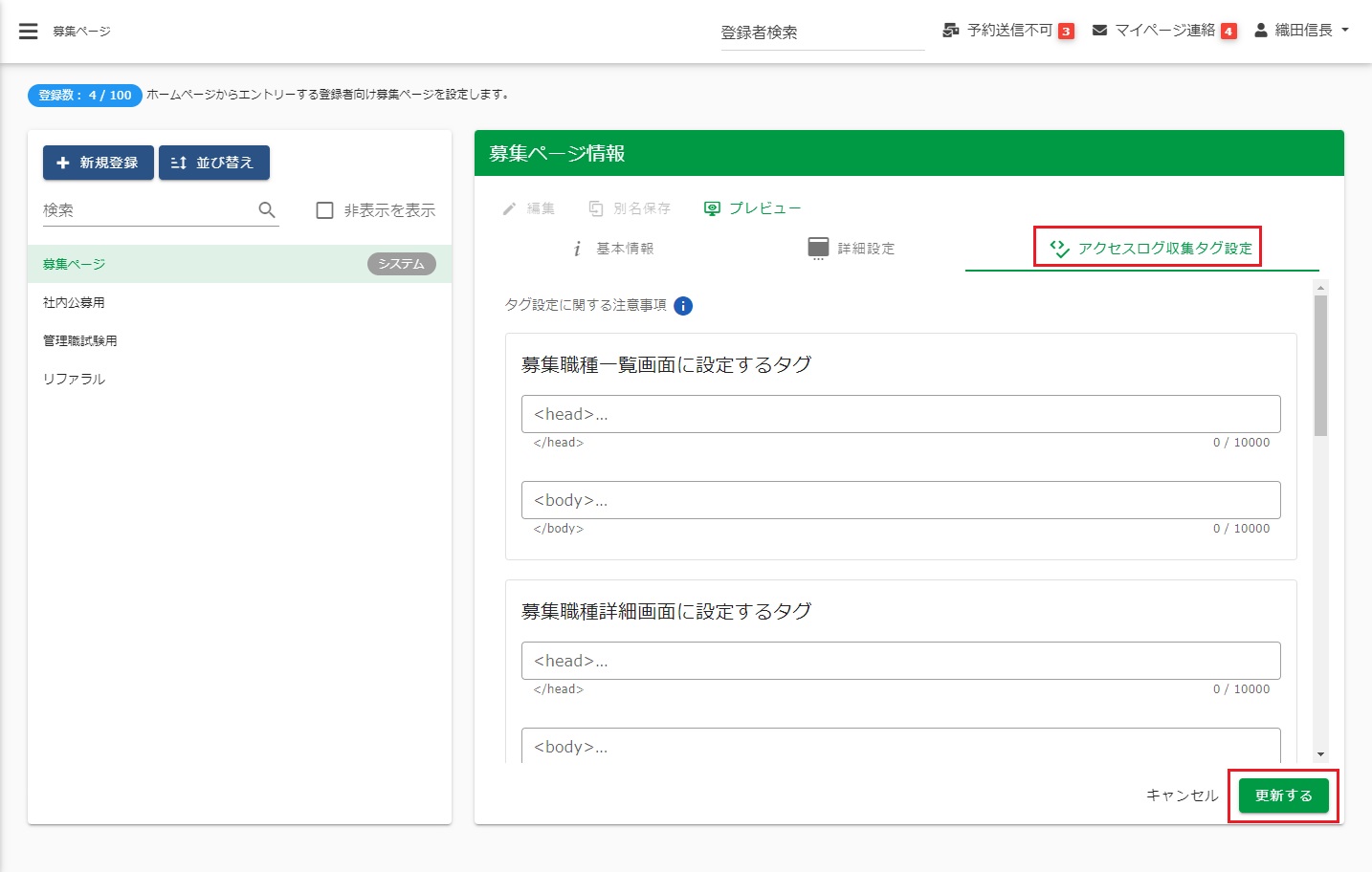 ここでは、設定済みの募集ページへの、タグの設定方法を説明します。