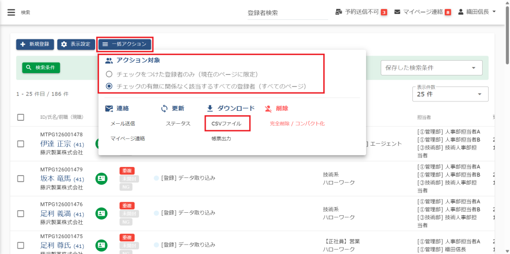 (3)[一括アクション]より、アクション対象を選択して、『ダウンロード』の[CSVファイル]をクリック、プルダウンメニューからダウンロード項目の設定を選択して、[ダウンロード]をクリックします。