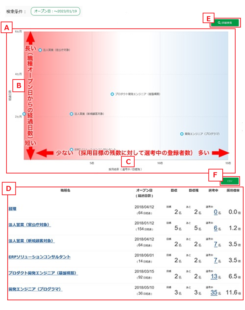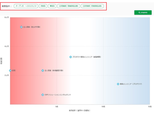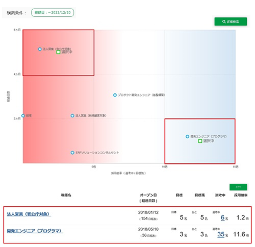 現在募集している職種ごとの「経過日数」(※1)と、「採用倍率」(※2)を軸とした散布図で、採用状況を分析することができます。