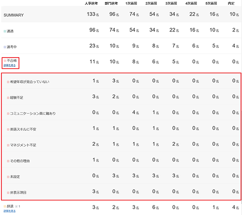 ※不合格の[詳細をみる]をクリックすると、部門書類選考、1次~5次面接の「総評」で登録された「評価理由」による内訳を表示します。