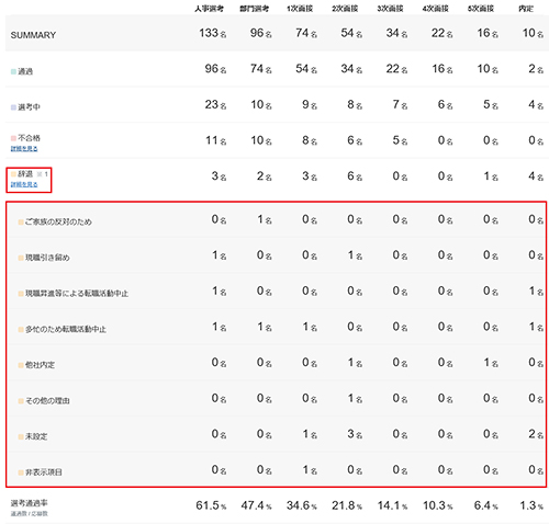 ※辞退の[詳細をみる]をクリックすると、部門書類選考、1次~5次面接の「総評」で登録された「評価理由」による内訳を表示します。