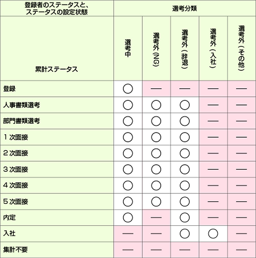検索条件にマッチした登録者のステータス(ステータスに設定している、「累計ステータス分類」、「選考分類」)に基づき、各プロセスの集計数を一覧表示します。