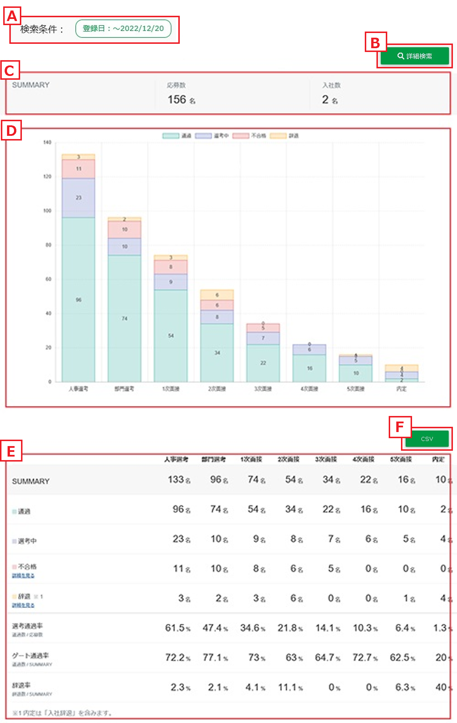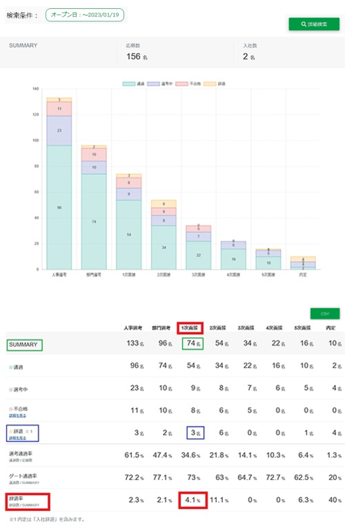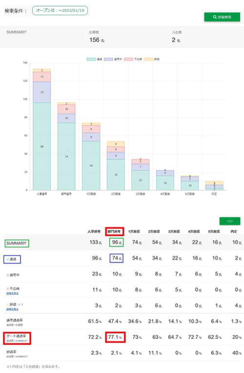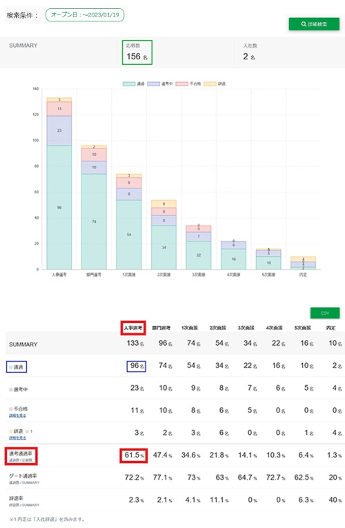 ステップの通過数96名 ÷ 検索マッチした応募数156名 = 選考通過率61.5 % となります。