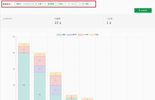 検索条件にマッチした応募数(すべての登録者数)と、その中の入社数を表示します。