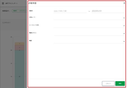 登録者の「登録日」、「応募ルート」、「エージェント会社」、「職種カテゴリ」、「職種」で検索ができます。