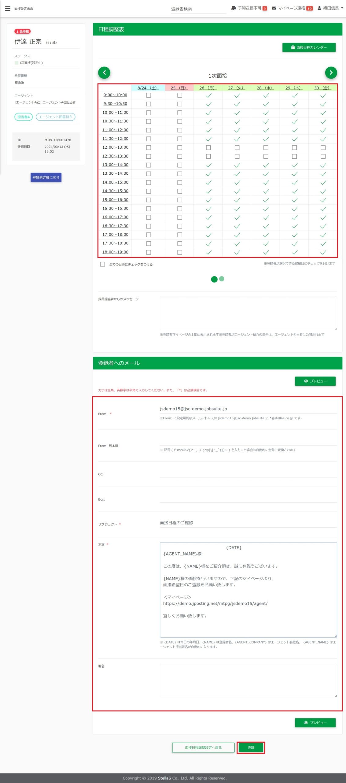 (3)日程調整表で、登録者(エージェント)が選択できる候補日にチェックを付け、メール内容確認後に[登録]をクリックします。(メールを送信するにした場合のみメール内容が表示されます)