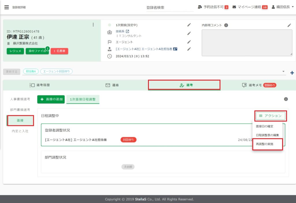 (1)登録者詳細画面の[選考]→[面接]→[アクション]→[再調整の実施]をクリックします。