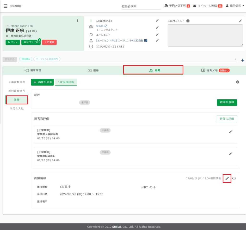 (1)登録者詳細画面の[選考]→[面接]→面接情報の[🖉]をクリックします。