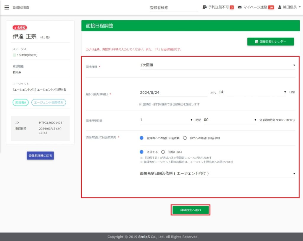 (2)「面接種類」「選択可能な候補日」「面接所要時間」を設定し、「面接希望の回答依頼先」で登録者と部門のどちらへ先に回答依頼をするか選択し、[詳細設定へ進む]をクリックします。