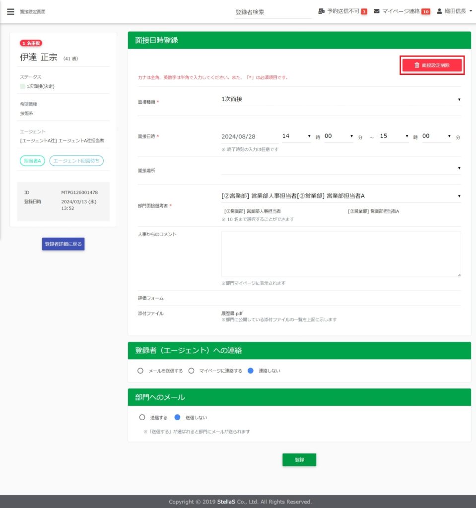 面接日時確定後に再調整を行う場合は、一度確定した面接情報を削除した上で面接日程調整、または面接日時の登録を行ってください。