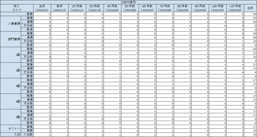 本機能は、選考実施回数などを月別に集計し分析表としてアウトプットする機能です。