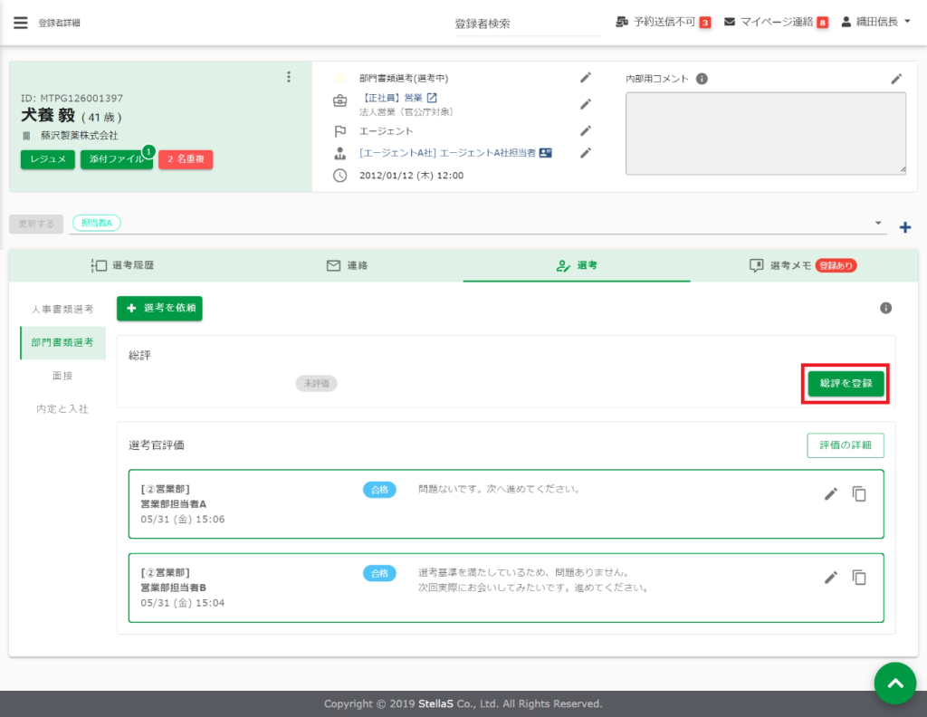 (5)部門書類選考者の評価結果をもとに、[総評]を入力し部門書類選考の結果を決定します。[総評]を入力することで、ステータスが連動して変更されます。