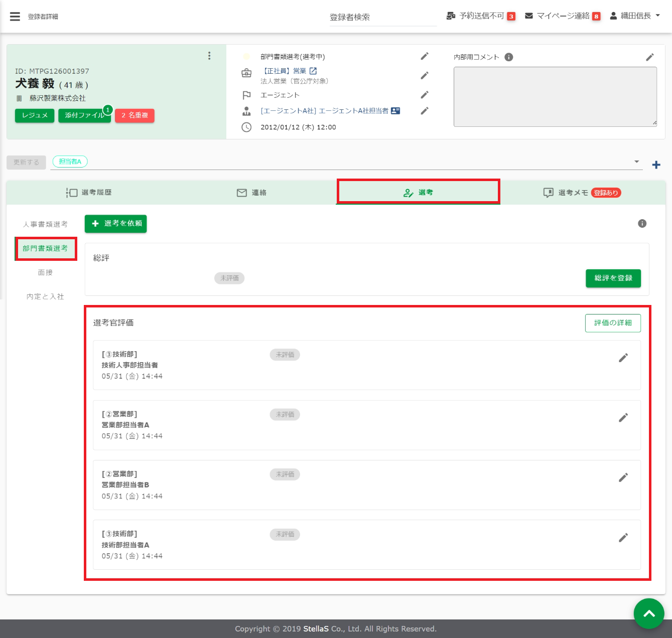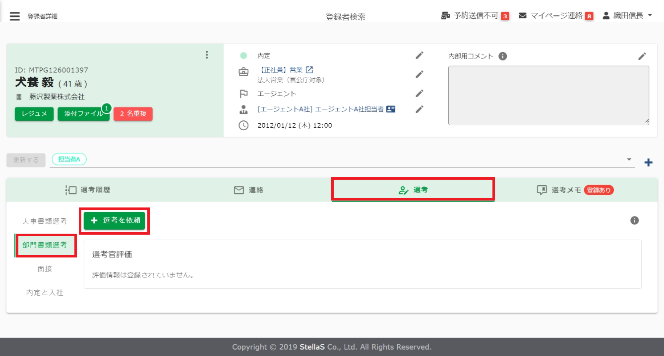 (1)登録者詳細画面の[選考]→[部門書類選考]→[選考を依頼]をクリックします。