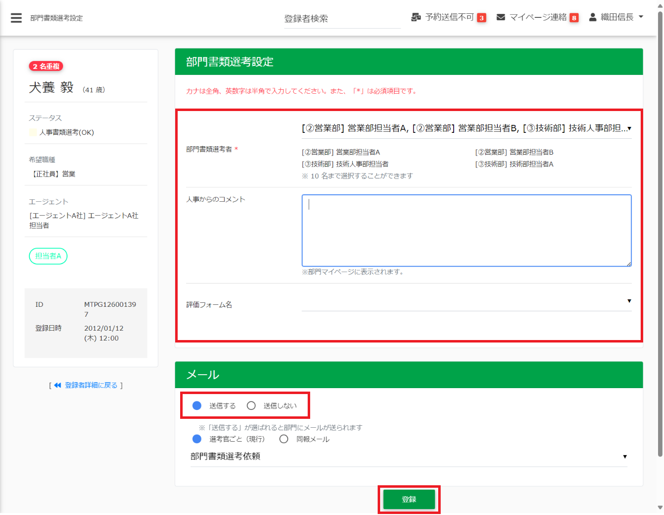 (2)選考依頼をするユーザーを選択、通知メール設定後、[登録]をクリックします。[登録]が完了すると部門書類選考者のマイページに登録者が表示され、部門書類選考者が評価入力ができるようになります。