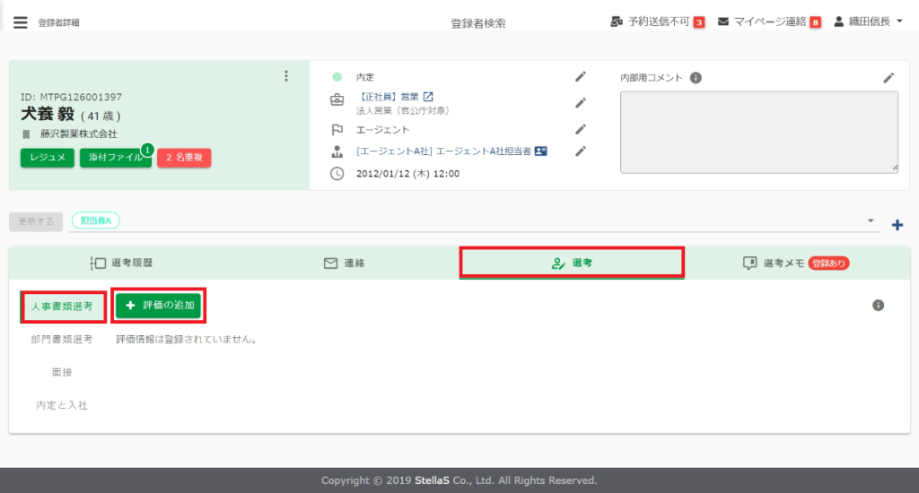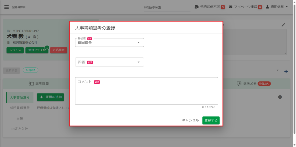 (1)登録者詳細画面の[選考]→[人事書類選考]→[評価の追加]をクリックします。