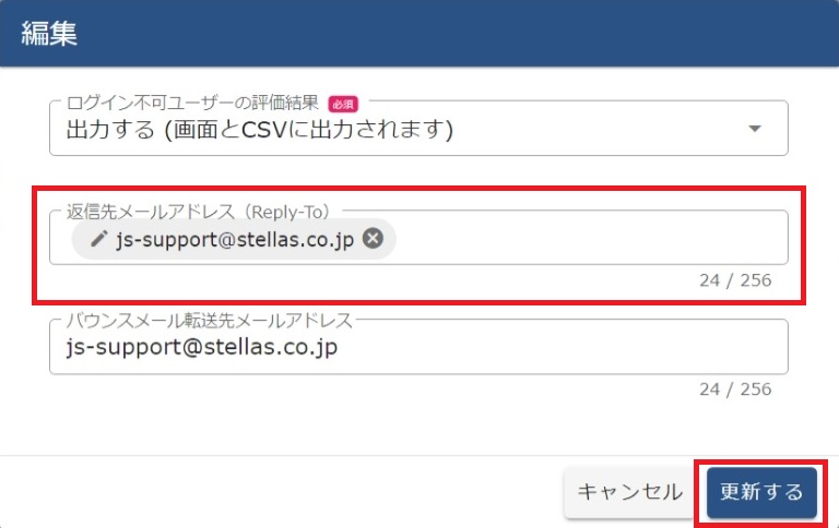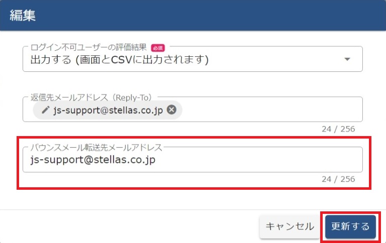 (7)JobSuite CAREERから送信したメールがエラーになった際の、バウンスメール(エラーメール)の転送先メールアドレスを入力して[更新する]をクリックします。