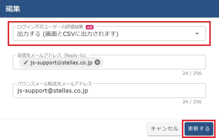 (3)[編集]をクリックし、ログイン不可に設定をしたユーザーの評価情報を表示する・CSVダウンロードする場合は、「出力する(画面とCSVに出力されます)」を選択して[更新する]をクリックします。