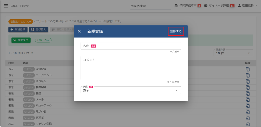 (4)応募ルートを新規追加する場合は、[+新規登録]をクリック、必要情報を入力し、[登録する]をクリックします。