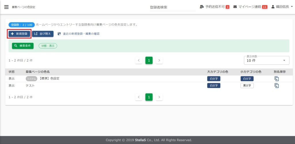 (4)募集ページの色を新規追加する場合は、[+新規登録]をクリックします。