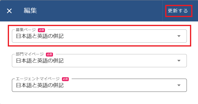(4)募集ページの【日本語と英語の併記】を選択して、[更新する]をクリックします。