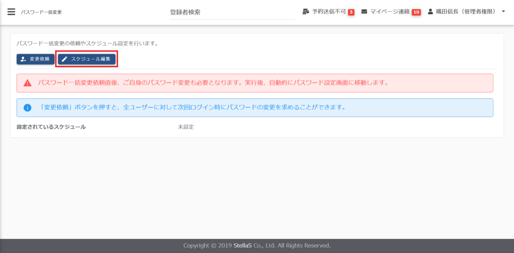 (4)登録済みユーザーの一括パスワードを変更する場合は、[スケジュール編集]をクリックします。