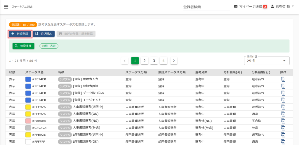 (3)ステータスを新規追加する場合は、[+新規登録]をクリックします。