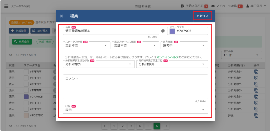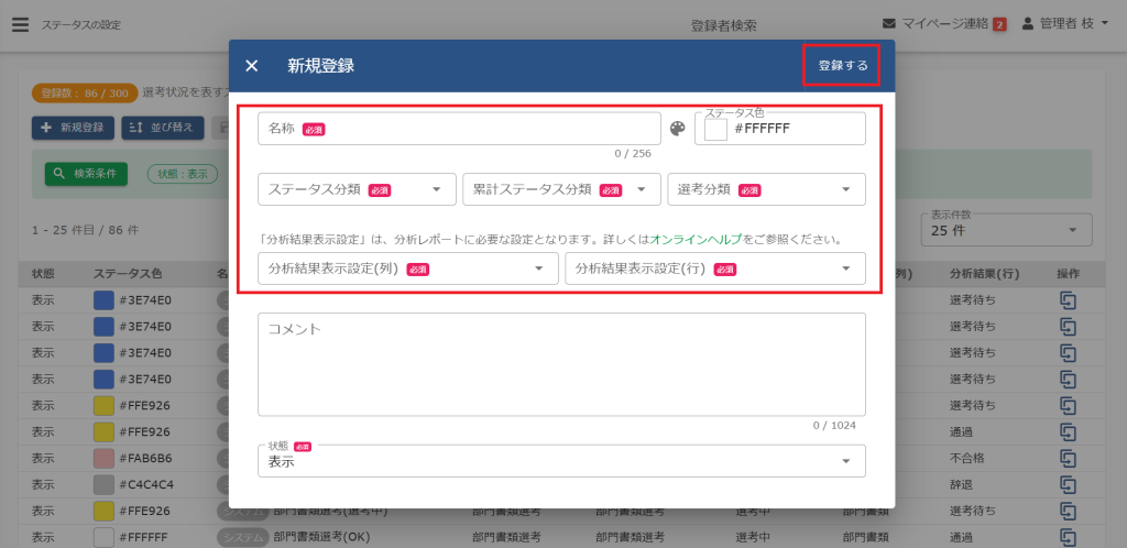 (4)「ステータス名」・「ステータス分類」・「累計ステータス分類」・「選考分類」の必須項目を入力します。