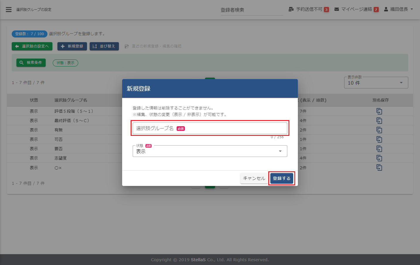 (3)選択肢グループを新規登録する場合は、[+新規登録]をクリックし、新規登録画面で「選択肢グループ名」を設定し、[登録する]をクリックします。