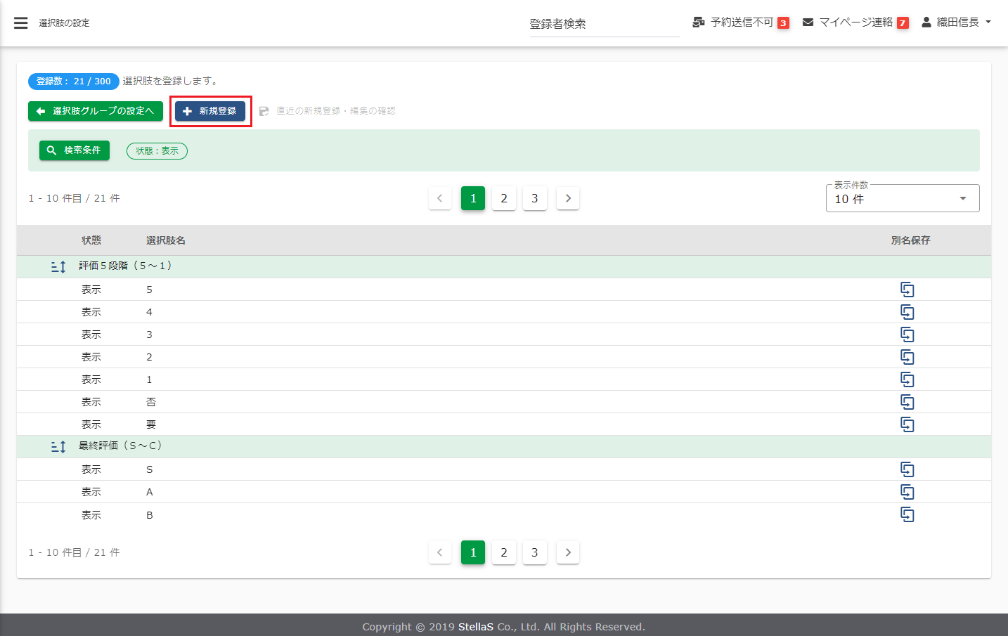 評価フォームを作成する際に、評価項目に対する回答を選択式にした場合、[選択肢グループ]を指定します。