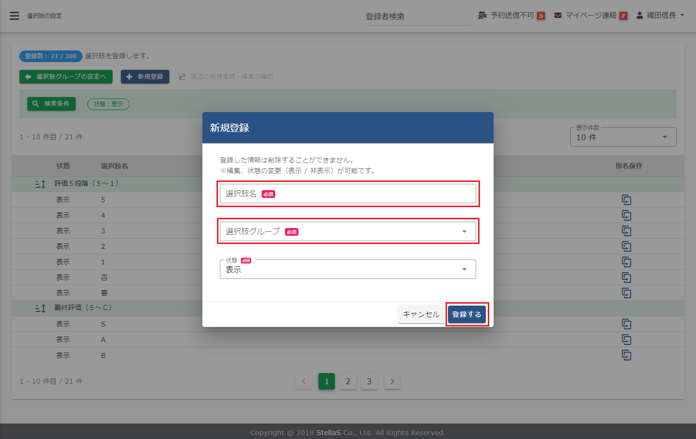 (3)選択肢を新規追登録する場合は、[+新規登録]をクリックし、新規登録画面で「選択肢名」を設定、グルーピングする「選択肢グループ名」を選択し、[登録する]をクリックします。