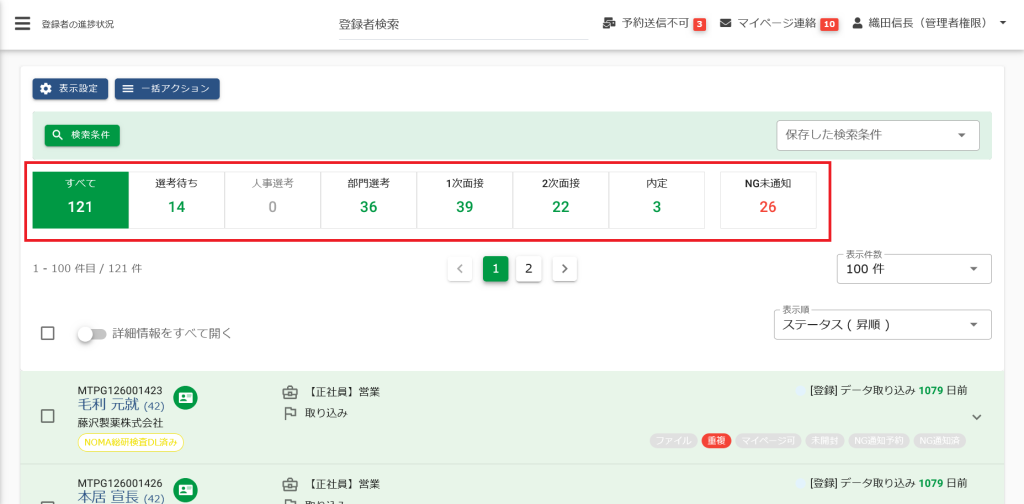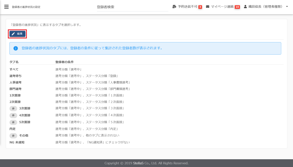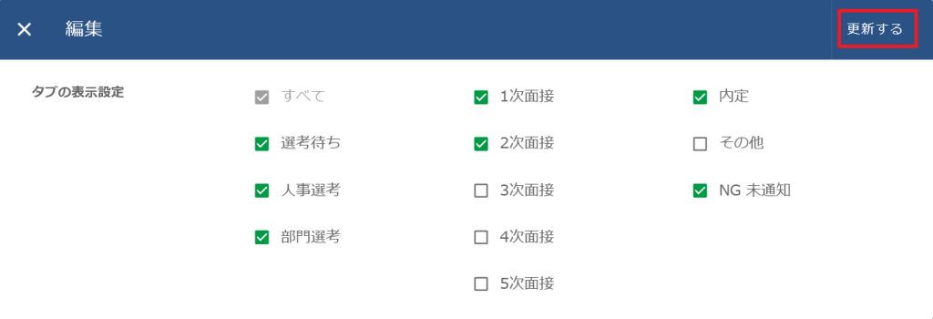 3次面接・4次面接・5次面接のチェックを外すと「登録者の進捗状況」に表示されなくなります。