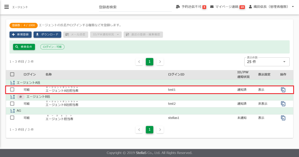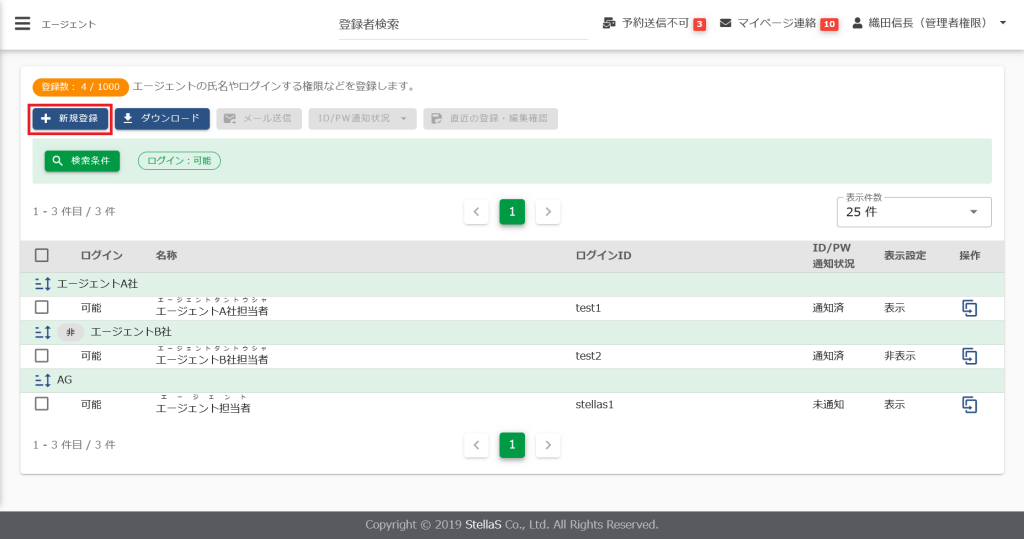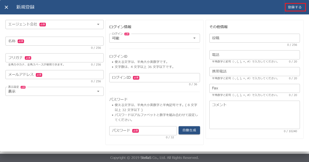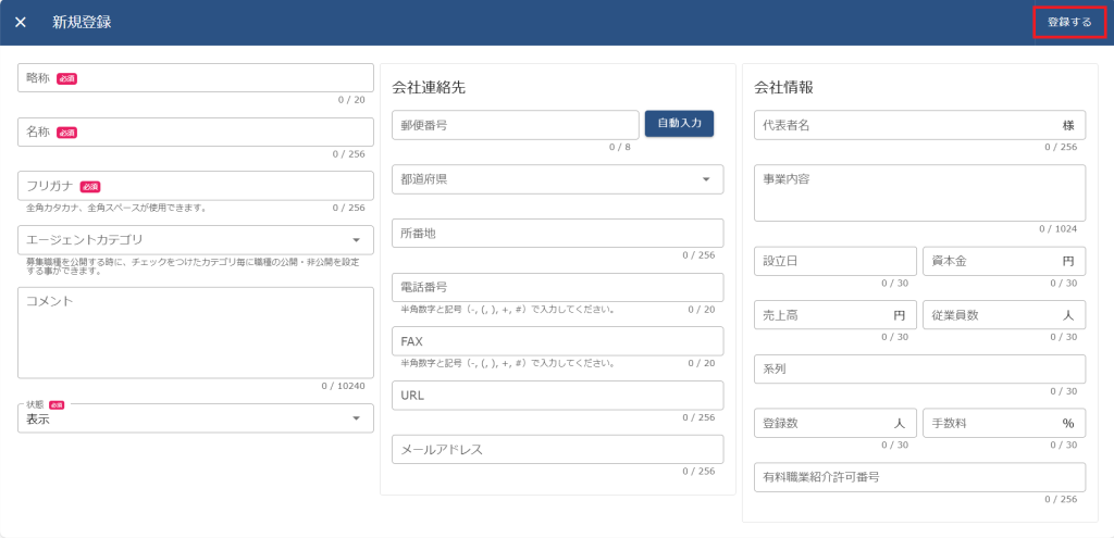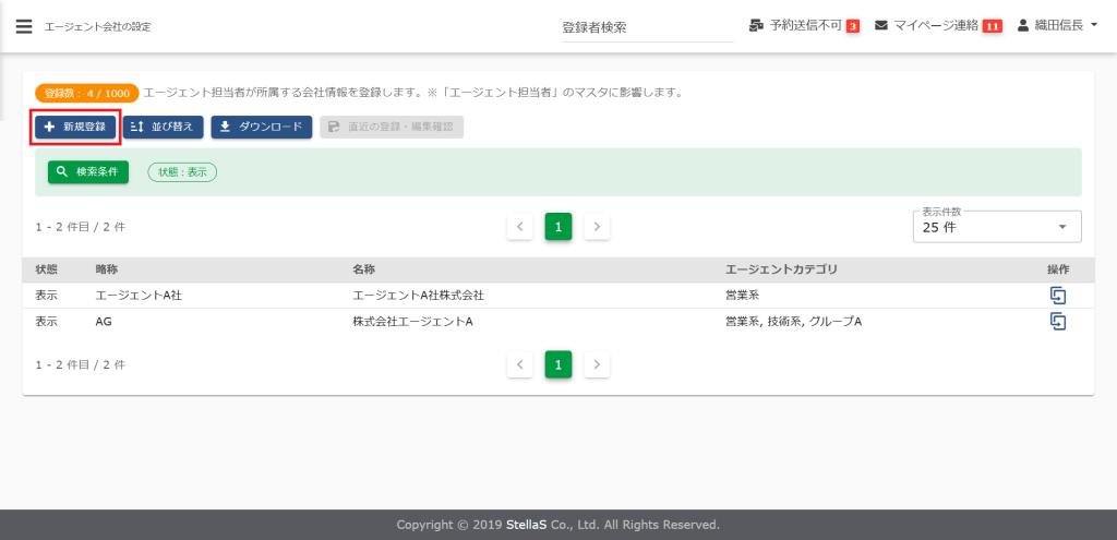 (2)[新規登録]をクリックし、[新規作成]画面でエージェント会社を登録します。